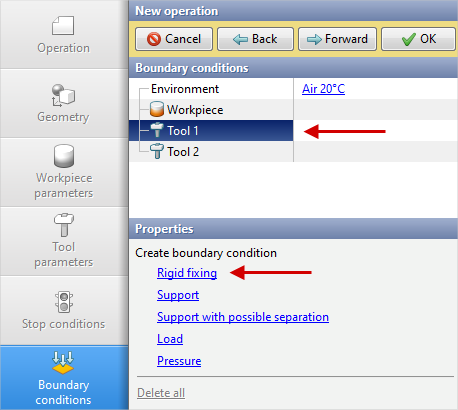 17.In the tab Boundary conditions it is should be set the fixing for the tools. Select Tool 1, and a list of boundary conditions will appear below. Click Rigid fixing