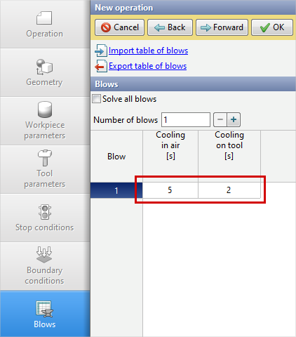 8.In the Blows tab set the cooling in air and in the tool. Click Forward