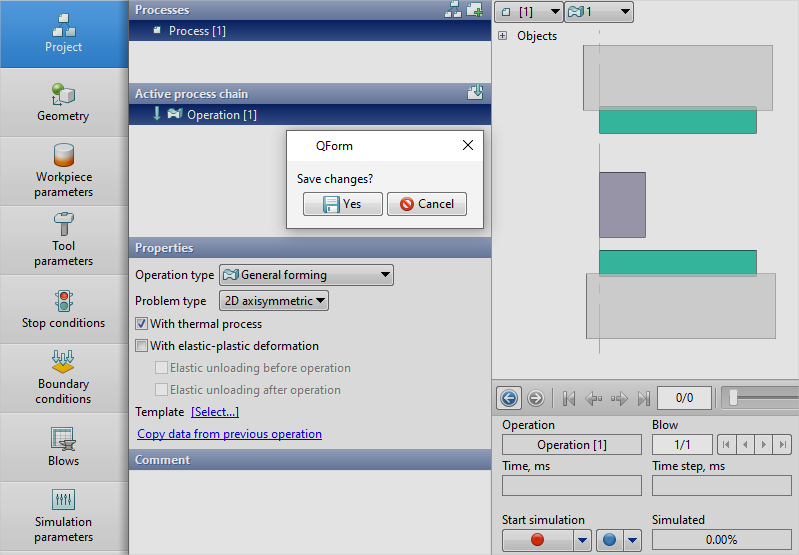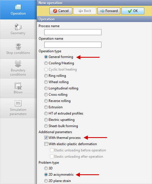 2.In the Operation tab select Operation type - General forming, With thermal process, Problem type - 2D axisymmetric. Click Forward