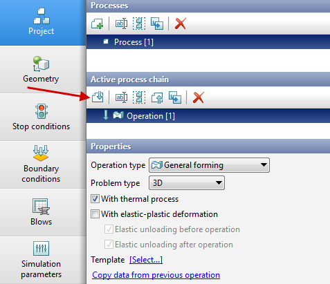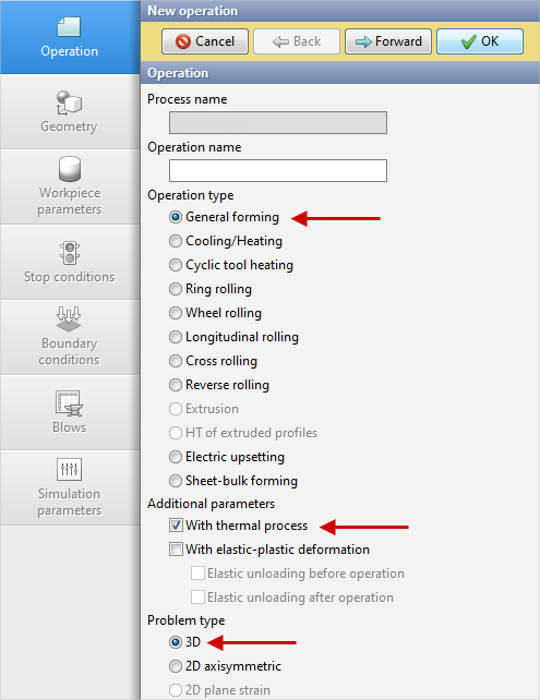12.In the Operation tab select Operation type - General forming, With thermal process, Problem type - 3D. Click Forward