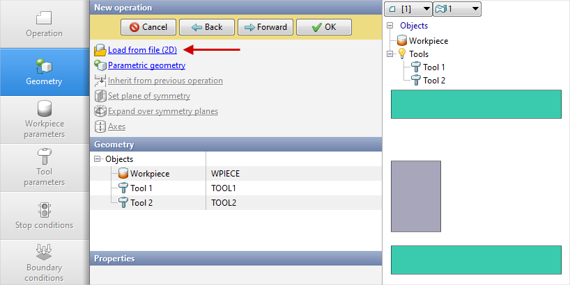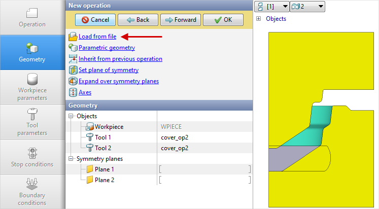 3.In the Geometry tab click Load from file and specify the path to the geometry file C:\QForm UK\12.0.1\geometry\cover\cover_op1.dxf. The uploaded geometry will appear on screen. Click Forward