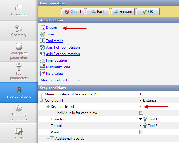 16.In the tab Stop conditions it is should be set the final distance between the tools. Click Distance. After that, specify the value of the final distance (2 mm). Click Forward