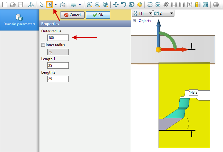 to switch to positioning mode and move the created domain so that it intersects the part of the tool to be fixed. Click OK