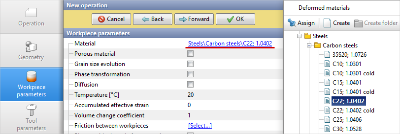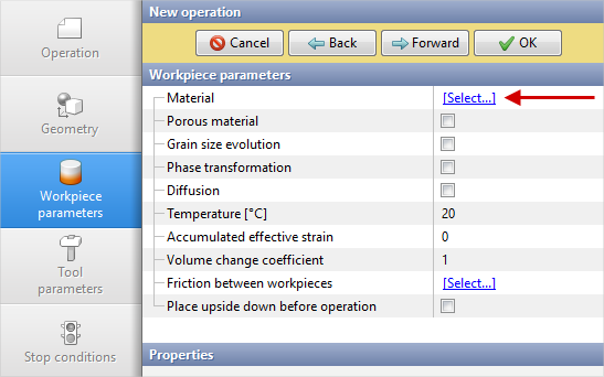 4.In the Workpiece parameters tab you need to set the material and workpiece temperature. Click opposite Material [Select...]