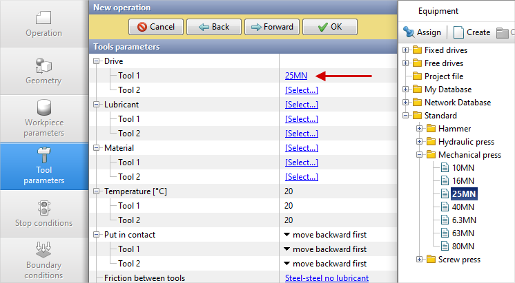 5.In the tab Tool parameters the drive type, temperature and lubricant must be select for each tool. To be noted that in this example Tool 1 - upper tool, and Tool 2 - bottom tool. Opposite Drive-Tool 1 click [Select...], and the equipment database window will be opened. Choose equipment Standard\Mechanical press\25MN and double click on it, after that the selected drive will appear opposite Drive-Tool 1