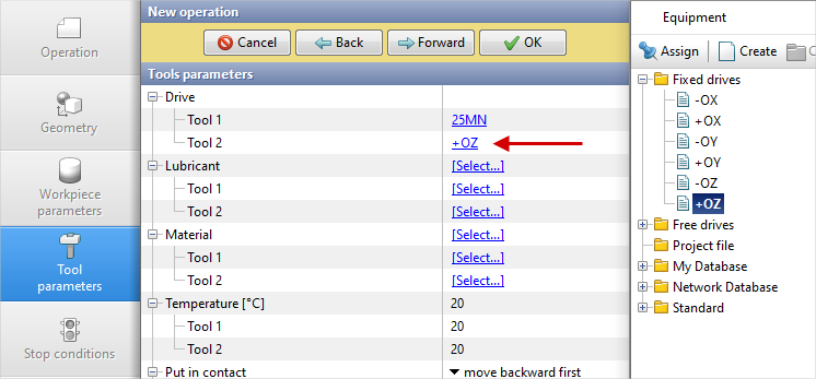 Tool 2 - fixed and it acts in the direction of the axes OZ. Next to Drive-Tool 2 click [Select...], in the equipment database window, select Fixed drives\+OZ and double click on it, the selected drive will appear in front of Drive-Tool 2