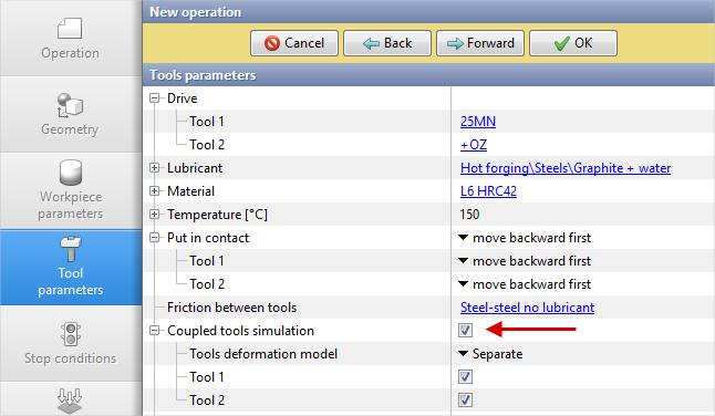 In order to take into account the elastic deformation of the tools during the simulation, check the box in front of Coupled tools simulation. Click Forward