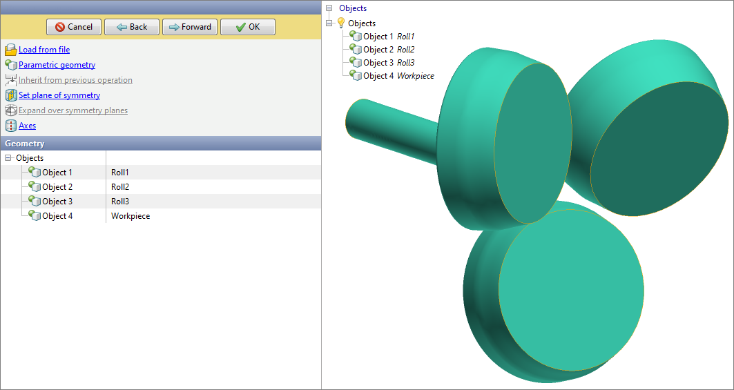 The geometric model of for cross rolling processes includes the workpiece itself and the deforming tool (rolls, rullers, Discher disks, mandrel). The geometry file imported from the CAD system (*.step, *.stp) must contain all the objects necessary for simulation . We recommend to make positioning of all geometric objects in the CAD system. Let's consider several ways of geometry import. 1. Direct Import To loading objects, execute the actions: •Go to tab Geometry; •Click on the button Load from file (3D) and in the window that opens, select the file (*.stp); •When the import process is completed, click the button OK.