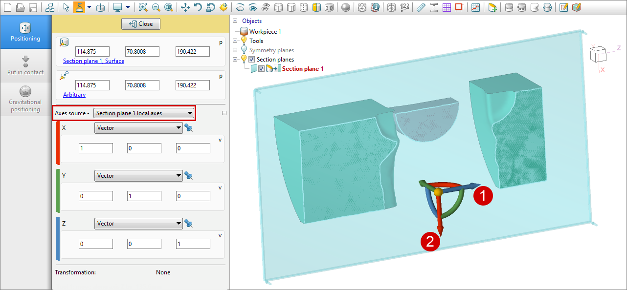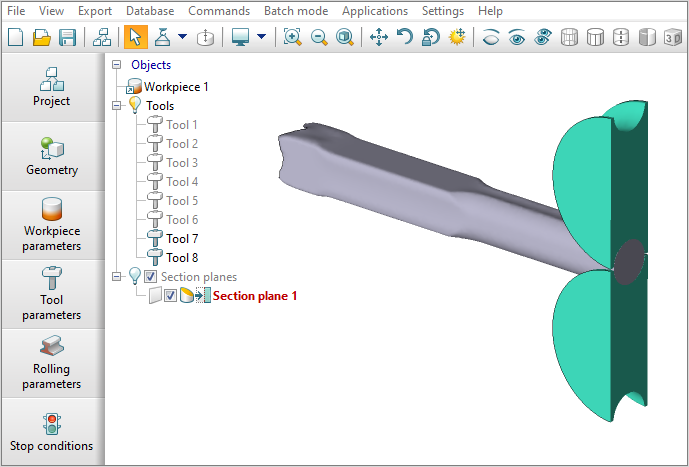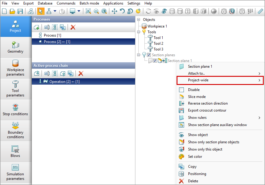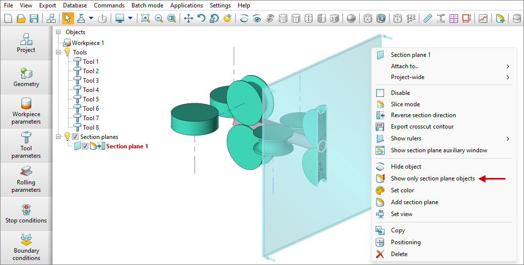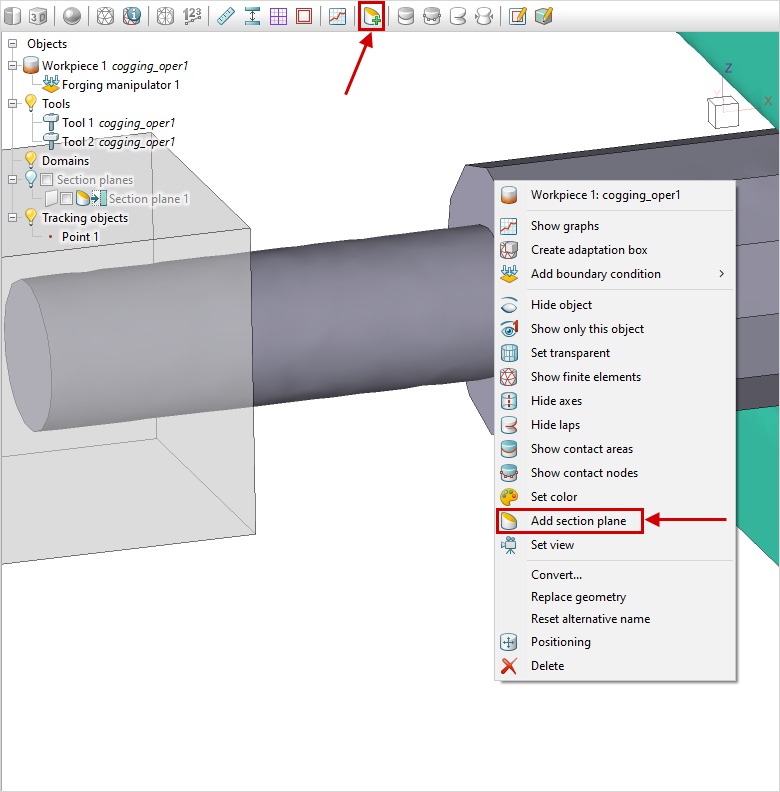located on the Toolbar. Additionally, a section plane can be defined via the context menu for objects (such as Workpiece, Tool, etc.) using the Add section plane command.