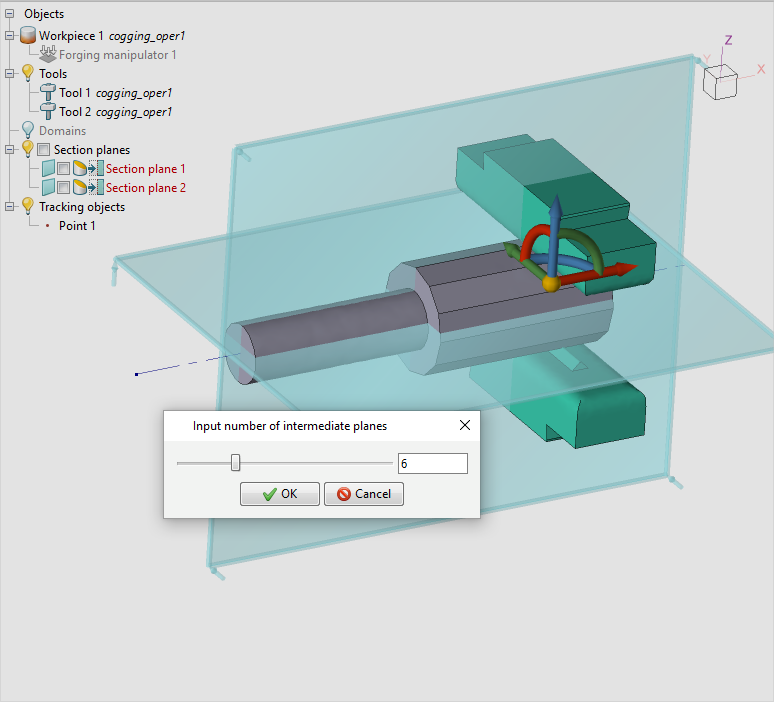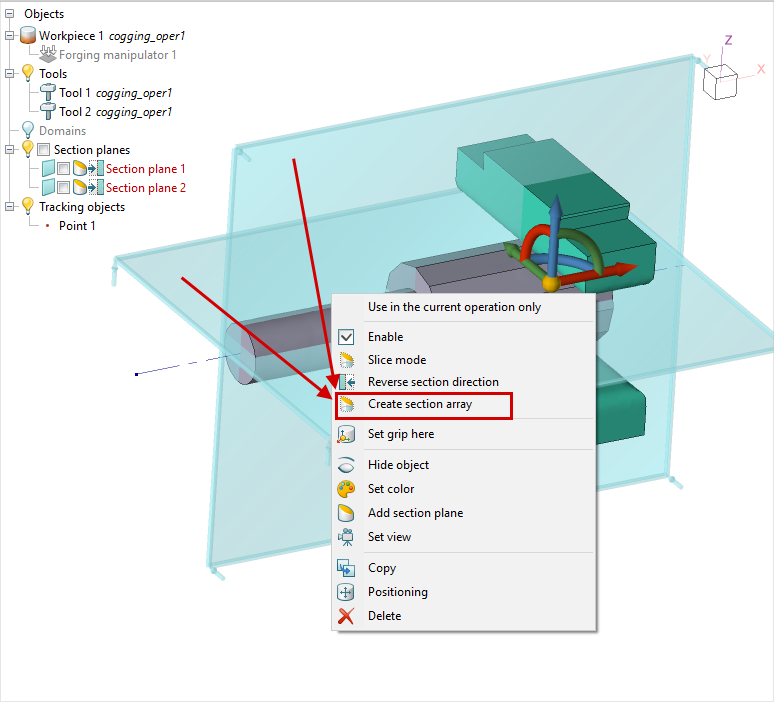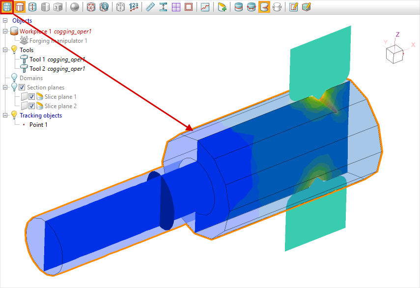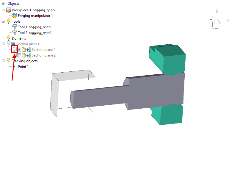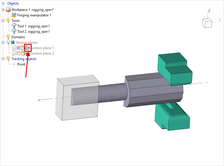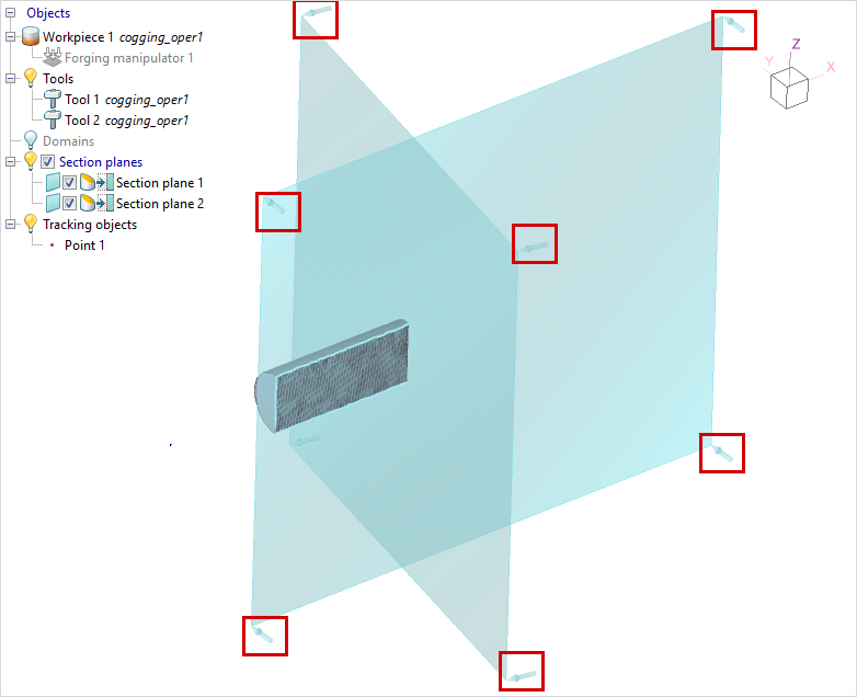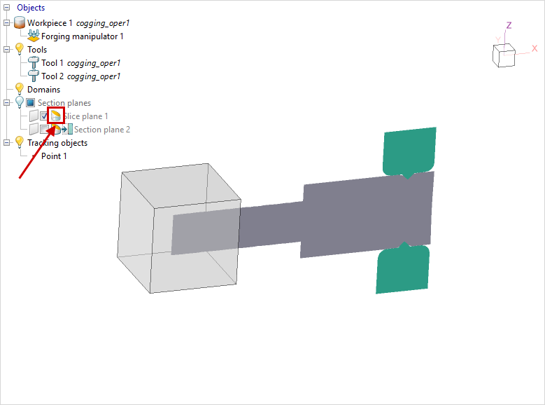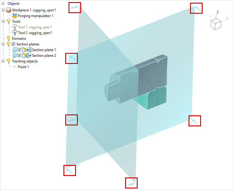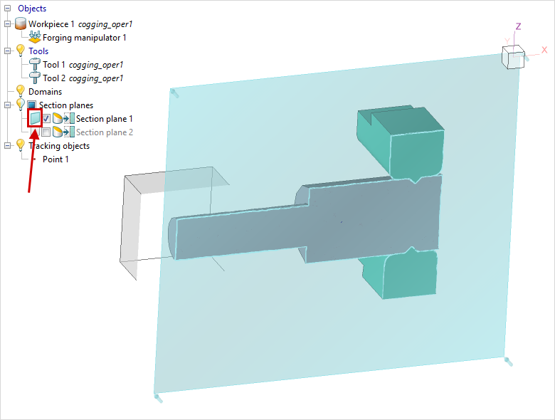 The Section plane creation tool can be used to view field values within a workpiece or tool, specify tracked points or lines within a workpiece, and perform measurements within the crosscut plane.