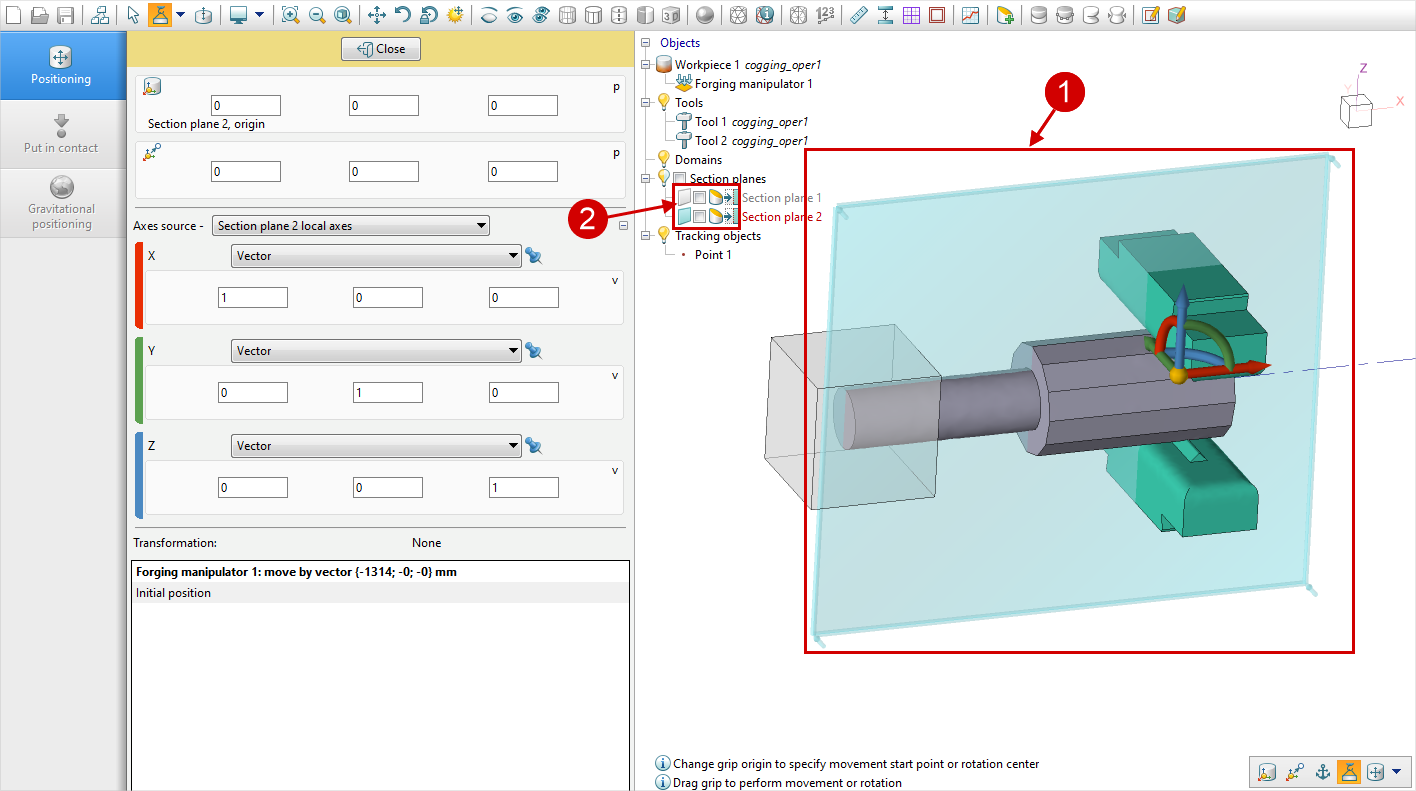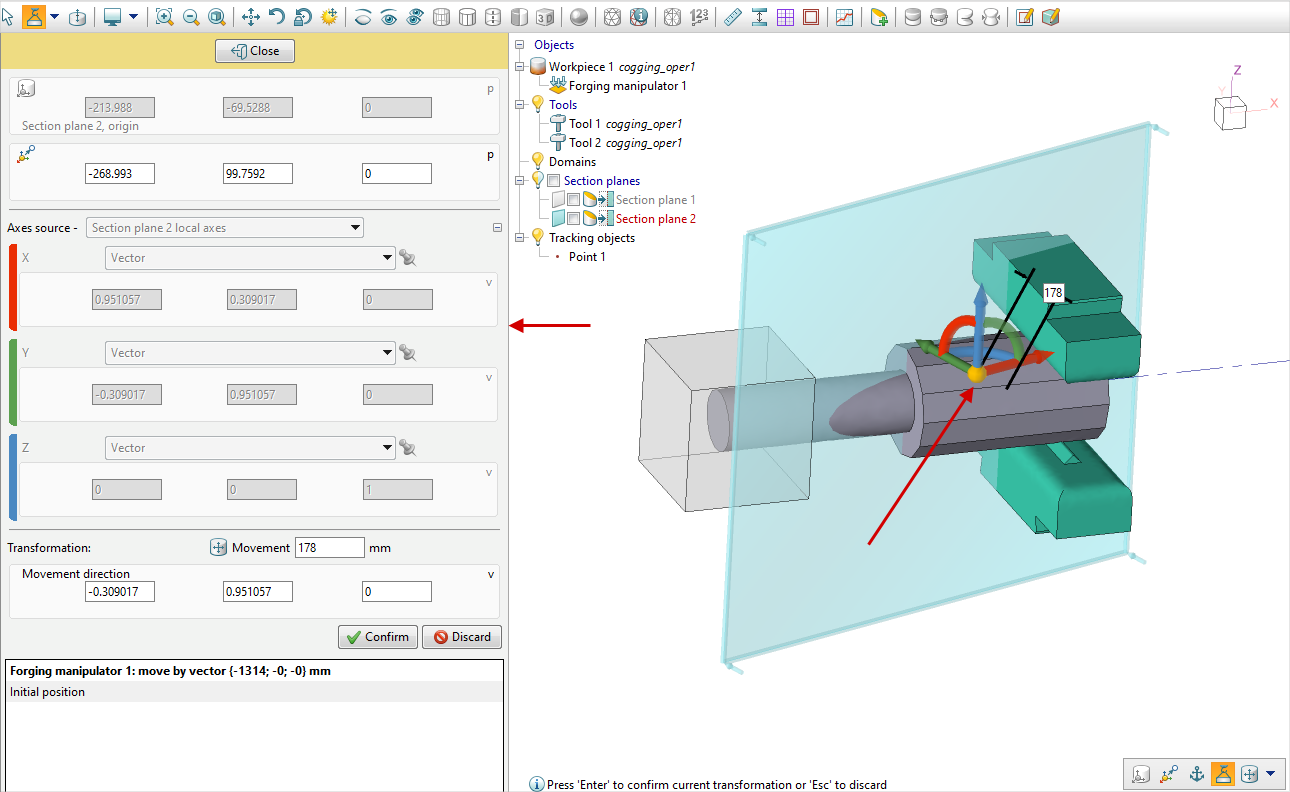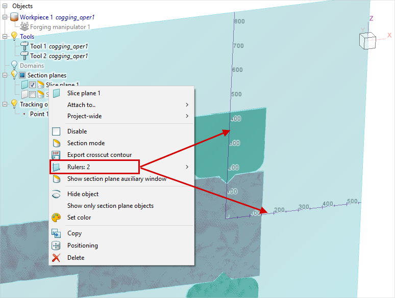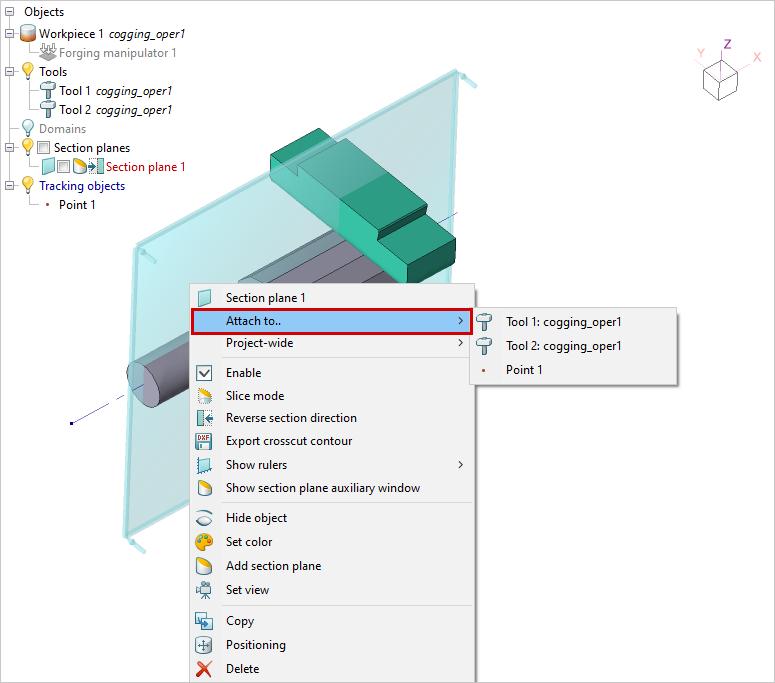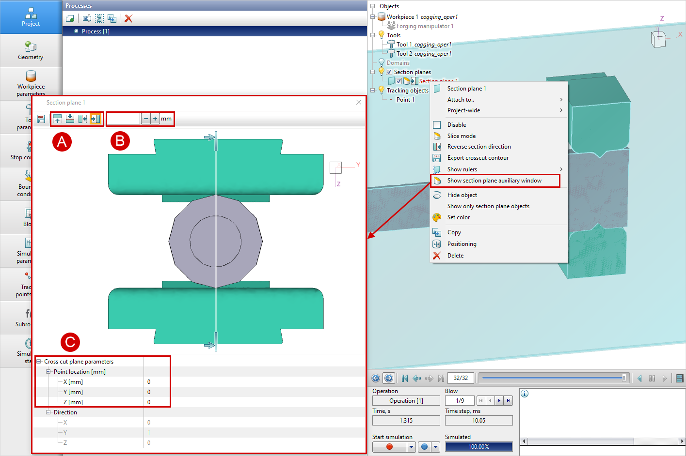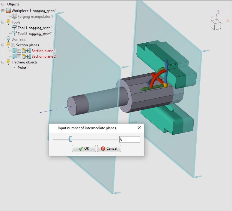 The Section plane creation tool can be used to view field values within a workpiece or tool, specify tracked points or lines within a workpiece, and perform measurements within the crosscut plane.