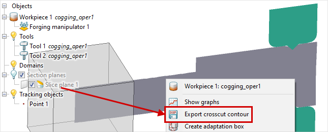 Export crosscut contour allows saving the section contour of objects as a 2D *dxf file. Contours for workpieces and tools that are enabled in the object tree are saved.