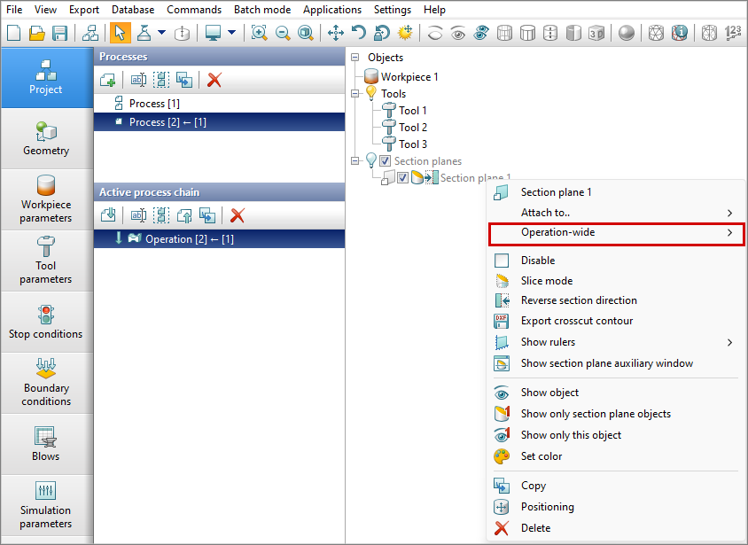 If the Operation-wide parameter is activated, the section plane is applied exclusively to the current operation: