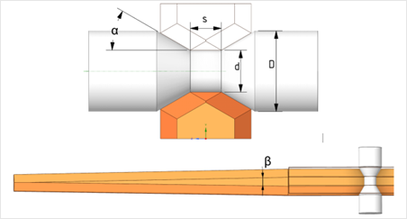Let's consider the work in the general forming module on the example of project assembly flat cross wedge rolling. The parameters of cross wedge rolling are shown in the figure: D = 26 mm - diameter of the billet, d = 20 mm - diameter of the resulting shaft section, s = 10 mm - width of the resulting shaft section, α = 40˚ , β = 2˚ - angles of the wedge.