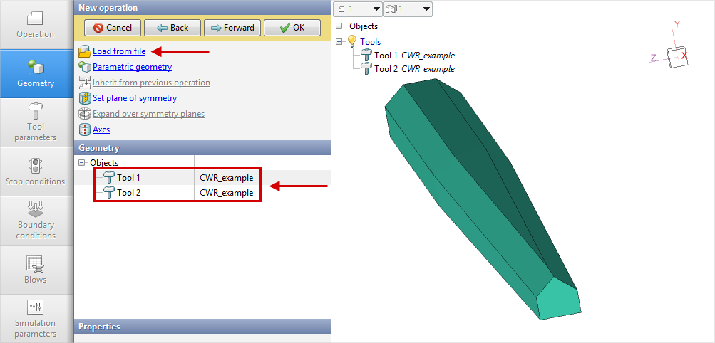 3.In the Geometry tab, click Load from file and specify the path to the geometry file C:\QForm UK\12.0.1\geometry\cross_wedge_rolling\cross_wedge_rolling.stp. The loaded geometry for Tool 1 will appear on the screen. Convert it to Tool 1. Since the top and bottom tools are the same, copy this geometry, name it Tool 2 and rotate it 180 degrees about the OZ axis. This should result in 2 tools: Tool 1(will move along the -OX axis) and Tool 2 (will move along the +OX axis) .