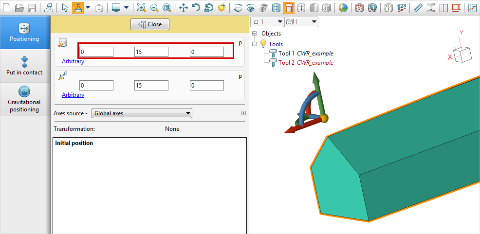 To do this, change the position of the grip Tool 2 by specifying the coordinates 0,15,0 as shown: