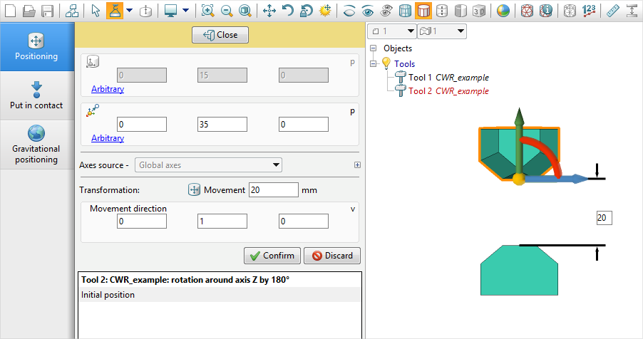 Rotate Tool 2 by 180˚. Tool 1and Tool 2 - in contact with each other. Now you can shift the tool by a distance equal to the diameter d = 20 mm: