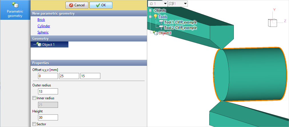 4.The workpiece is created parametrically. To do this, click Parametric geometry and create a cylinder as shown in the figure.
