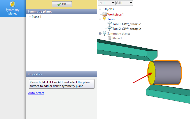 In this case, convert the created cylinder to Workpiece 1 and add a symmetry plane.