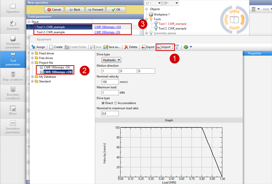 6.In the Tool parameters tab, set the tool to be imported beforehand. To do this, in the Equipment Database, click import (1) and select the files CWR 100mmps +OX.qdat-bin and CWR 100mmps -OX.qdat-bin (from the same folder <%DEFAULTDIR%>geometry\cross_wedge_rolling ). Save the imported tools to the project file (2) and assign to Tool 1 - CWR 100mmps +OX and for Tool 2 - CWR 100mmps -OX (3).