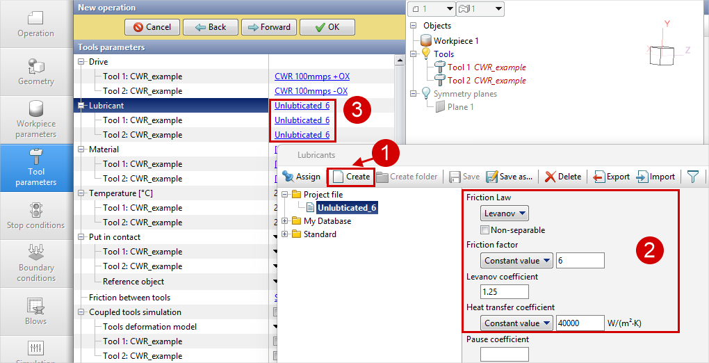 7.In the Tool parameters tab, we also set the lubricant, which must be created beforehand. In this example, there are no additional guides to rotate the forging, so rotation will be set by the entire tool surface. For this purpose, we create (1) a lubricant type Unlubticated_6 with a friction factor of 6 (2) set for the whole tool (3). If there are guideways and lateral grooved or toothed surfaces - lubrication Unlubticated_6 is only specified on them. On other surfaces, you can set the standard lubrication type Unlubricated (default friction factor 0.9), or set Unlubticated_6 everywhere .