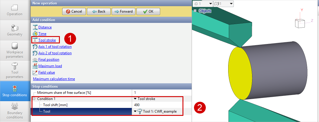 8.In the Stop conditions tab, assign a time stop to the process and click Forward. The Boundary conditions and Blows tabs remain unchanged.