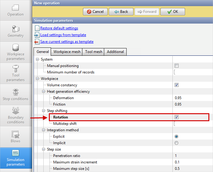 9.In the Simulation parameters tab, under General activate the option Rotation (Step shifting).