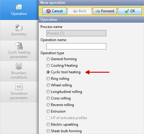 Operation type – Cyclic tool heating is available for selection only as a second operation. In the first operation you should select Operation type – General forming. Also in the first operationHeat transfer to workpiece - Coupled should be set. |