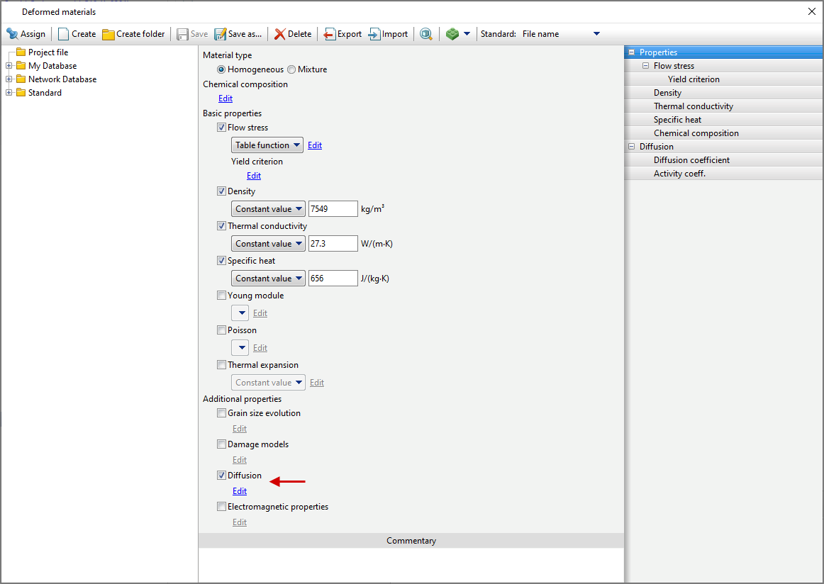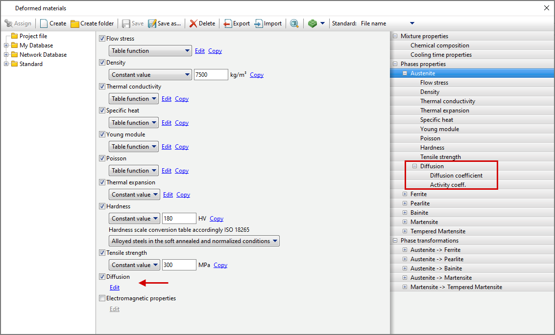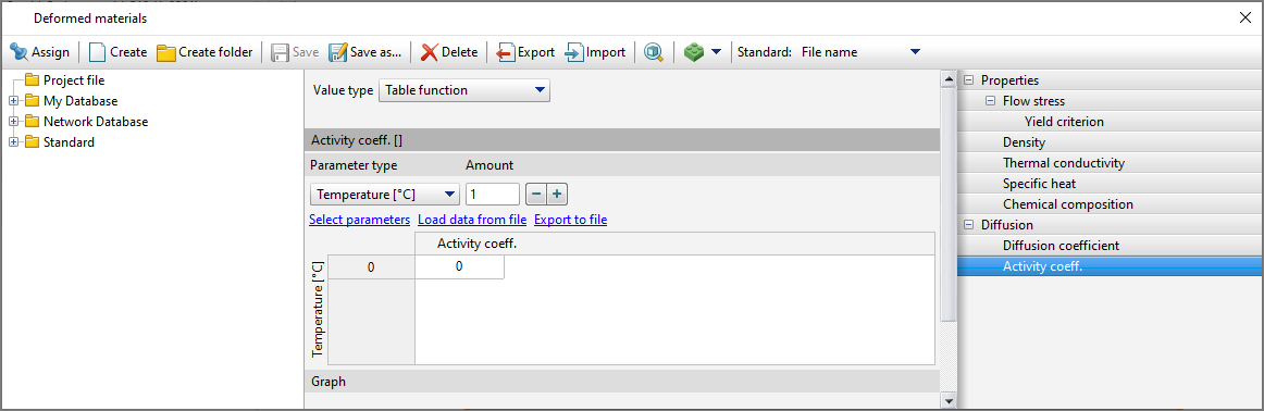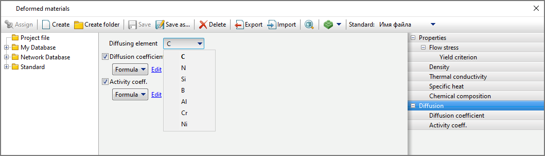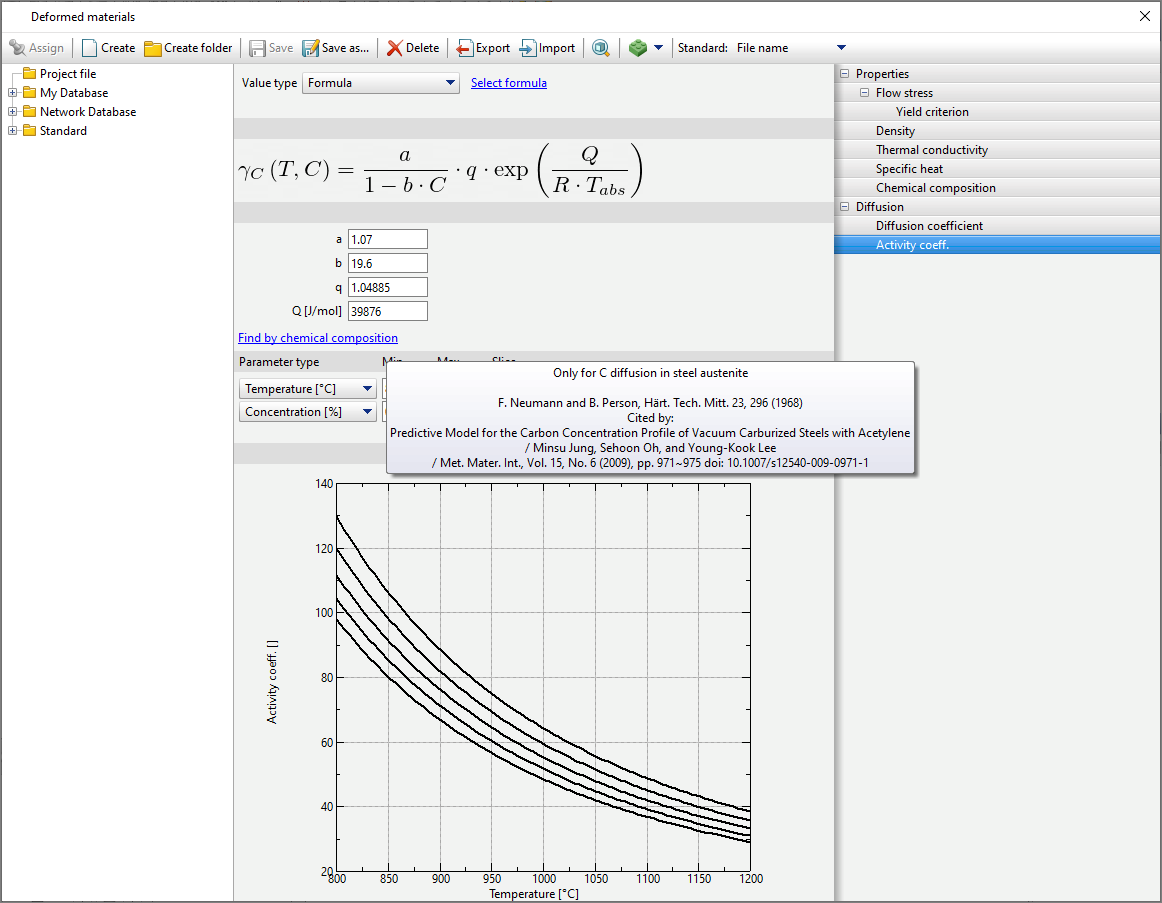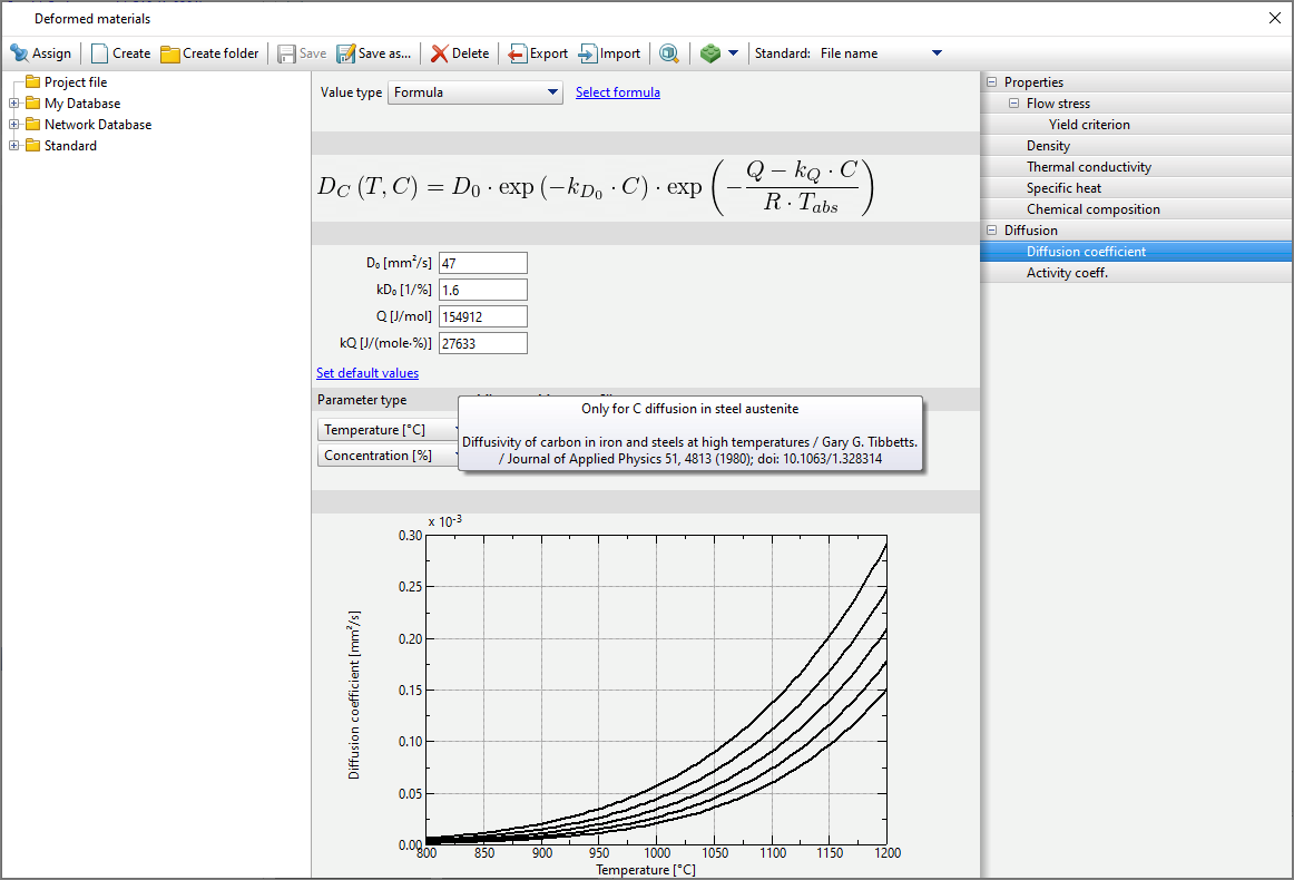 diffusion Parameters for the workpieces are set in the material properties in Database of deformed materials. To do this, you need to select the material and in the tab Properties activate Diffusion. By activating Diffusion it becomes possible to edit the corresponding parameters. QForm UKallows you to specify the diffusing element. Choosing carbon C The user will have access to some function for selecting formula values. Next you need to specify diffusion Coefficient And Activity coeff. For diffusion Coefficient The following methods of specifying data are available: Constant value, Table function And Formula.