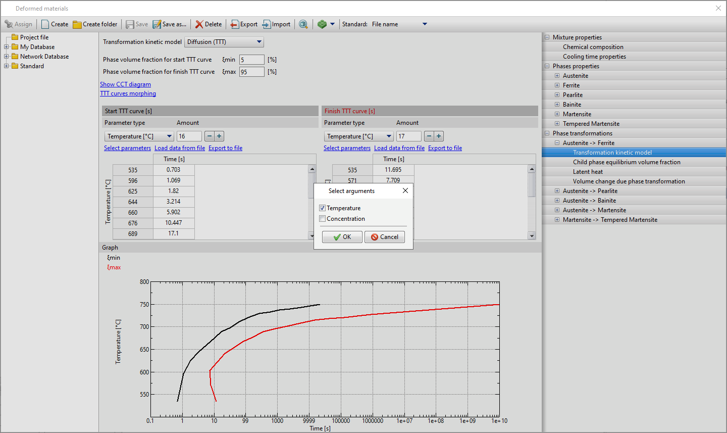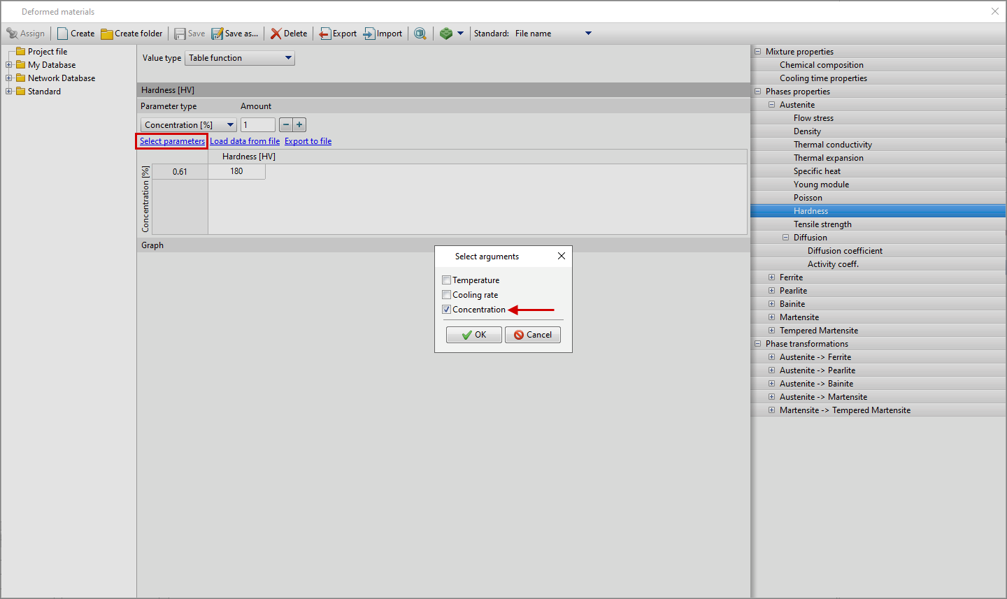 In a similar way, you can set material parameters for a material type Mixture. Select a multiphase material and go to a specific phase to specify data. See also: For multiphase materials it is also possible to specify Hardness And Tensile strength depending on concentration. The kinetics of phase transformations can also depend on concentration. For all transformation models except Diffusion (formula) it is possible to select an argument Concentration. In addition to the transformation models, the dependence on concentration can be specified for: •Equilibrium volume phase vol. fraction; •Latent heat of phase transformation; •Volume change during phase transformation. See also: |