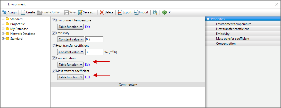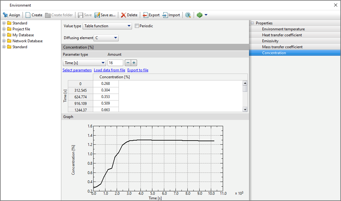 diffusion Parameters for the environment are set in the properties of the environment in Environment Database. To do this, you need to select the environment and in the tab Properties activate Concentration And Mass transfer coefficient. By activating Concentration it is necessary to select a diffusing element and indicate either a constant value of the concentration of the selected element, or the dependence of the concentration on temperature or time. By activating Mass transfer coefficient it is necessary to indicate either a constant value of the coefficient, or the dependence of the mass transfer coefficient on temperature or time. After specifying the necessary data, it is necessary to save the environment and specify it as a boundary condition in the simulation. |