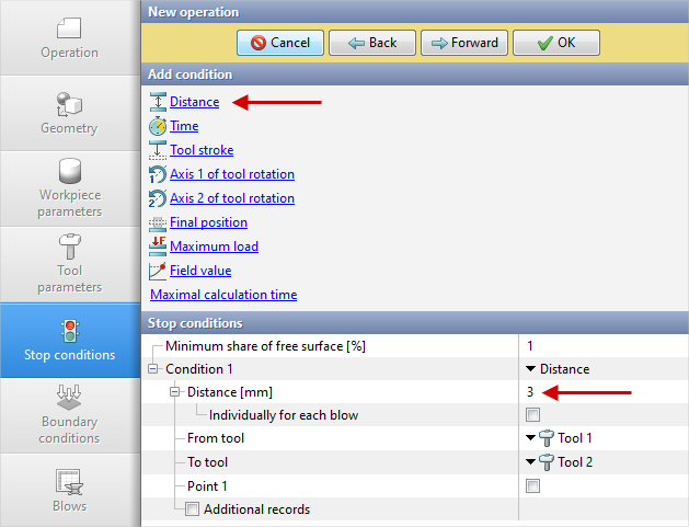 6.In the Stop conditions tab you should set final distance between the tools. Click Distance. After that, specify the value of the final distance (3 mm). Click Forward
