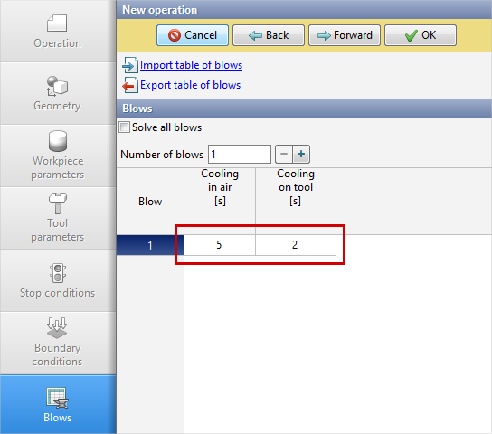 8.In the Blows tab set the cooling in air and in the tool. Click Forward