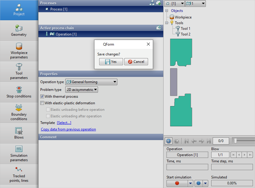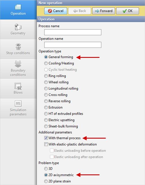 2.In the tab Operation select Operation type - General forming, With thermal process and Problem type - 2D axisymmetric. Click Forward