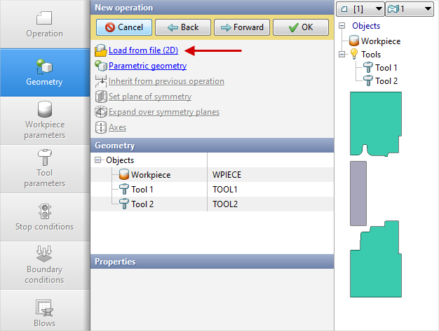 3.In the tab Geometry click Load from file and specify the path to the geometry file C:\QForm UK\12.0.1\geometry\disk_2D\disk_2D.dxf. The uploaded geometry will appear on screen. Click Forward