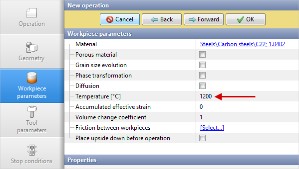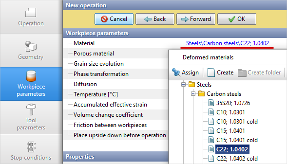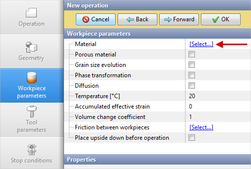 4.In the Workpiece parameters tab you need to set the material and workpiece temperature. Click next to Material[Select...]