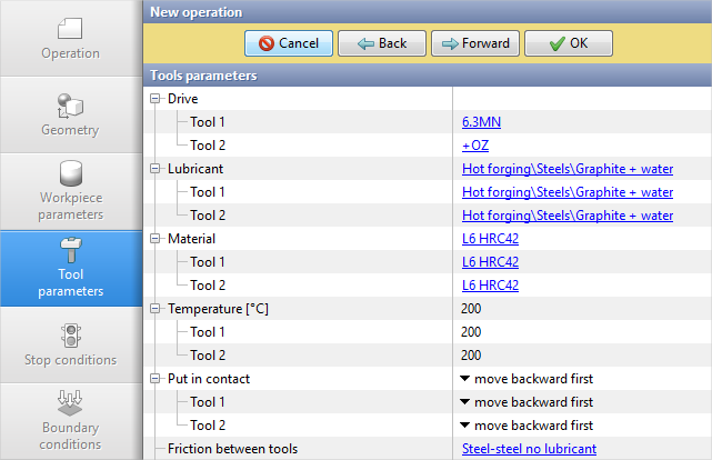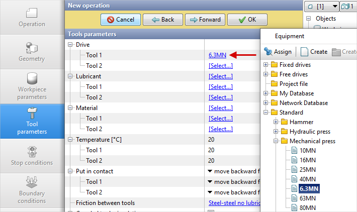 5.In the tab Tool parameters the drive type, temperature and lubricant must be select for each tool. To be noted that in this example Tool 1 - upper tool, and Tool 2 - bottom tool. Opposite Drive-Tool 1 click [Select...], and the equipment database window will be opened. Choose equipment Standard\Mechanical press\6.3MN and double click on it, after that the selected drive will appear opposite Drive-Tool 1
