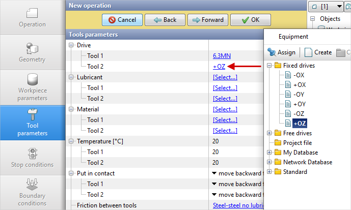 Tool 2 - fixed, and it acts in the direction of the OZ axes. Opposite Drive- Tool 2 click [Select...] , in the equipment database window , select Fixed drives\+OZ and double click on it, the selected drive will appear opposite Drive- Tool 2
