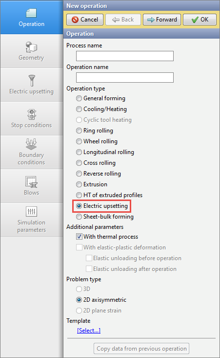 For simulation in the module Electric upsetting it is required in the tab Project Initial data panel to select operation type Electric upsetting :