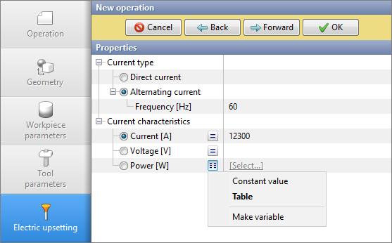 After selecting this type of process on Initial data panel an additional tab Electric upsetting will appear, in which the necessary parameters for the simulation are set: