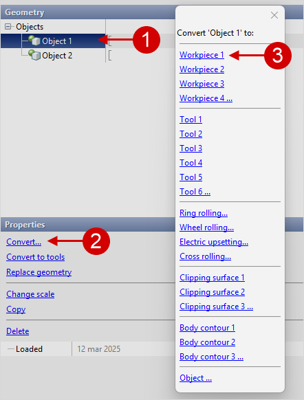After loading the geometry from file, you can change the type and number of any object. To do this, select the corresponding object in the list, press Convert... and in the window that opens, change the type of this object and the number, for example: