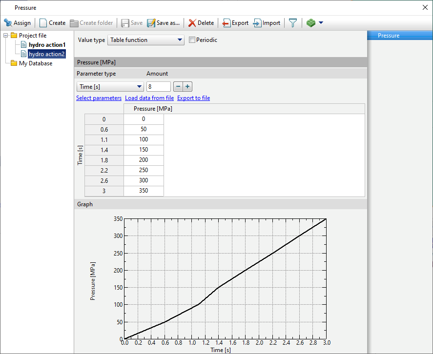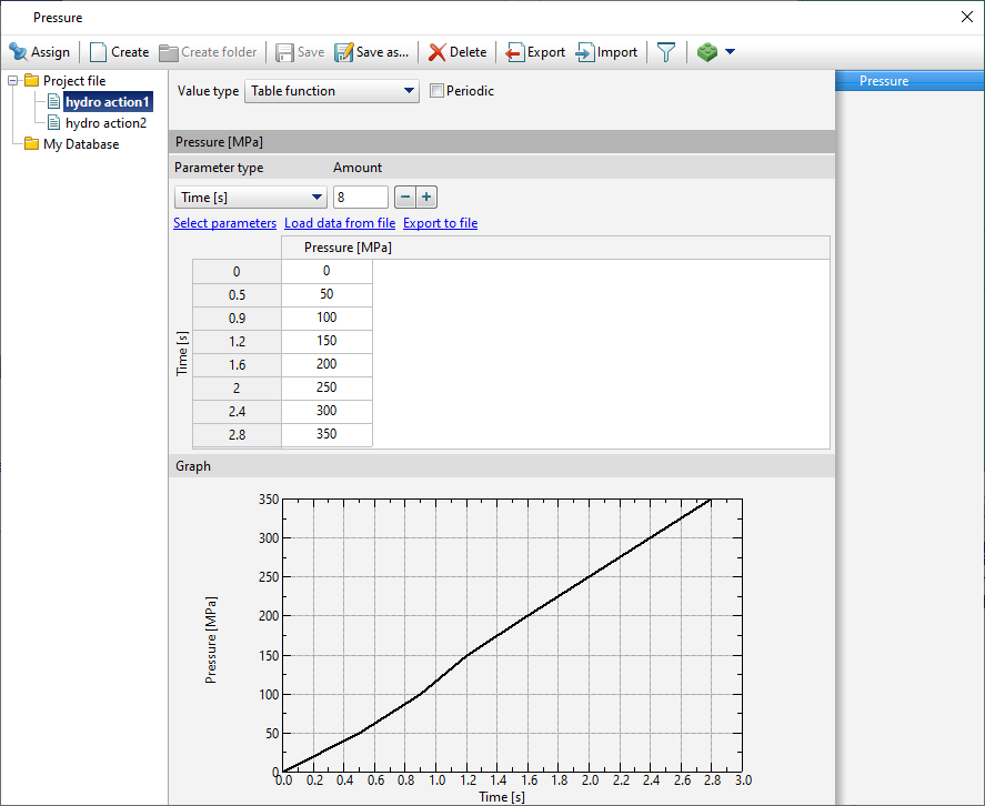 Press on Table, then click on [Select...] a database window will open where a table of pressure values depend on time should be created. Click Create. In the graph Value type select Table function and enter the pressure value from the Table 1 (refer to initial data). After that click Save and set the table name, for example, hydro action1. Click the button Assign or double click on the table name, then close the database window