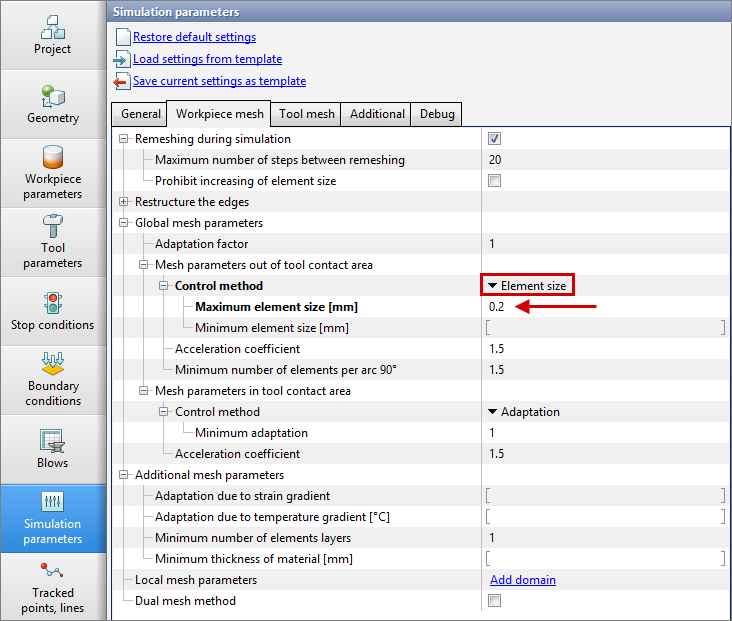 9.In the Simulation Parameters tab, you need to set the maximum element size equal to 25-30% of the wall thickness of the workpiece. To do this, go to the Workpiece mesh tab, change the method of setting the Element Size, set the Maximum element size parameter to 0.2 mm. Click OK