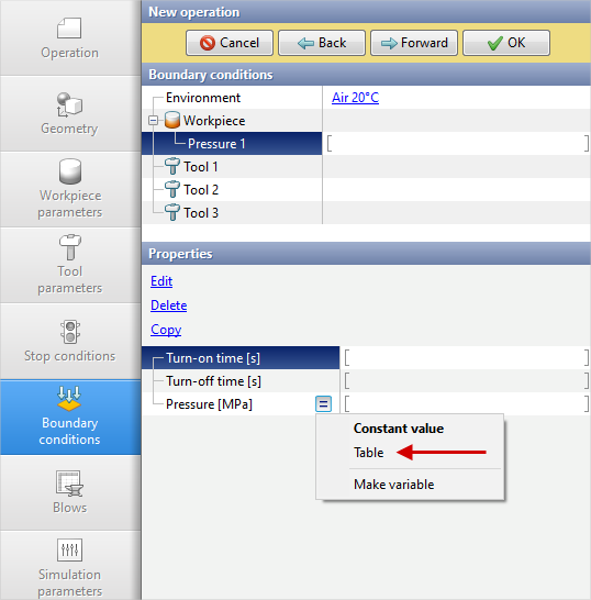 After that, you need to set the pressure value. In the drop down menu Value type select Table