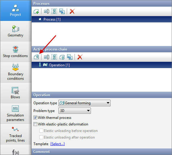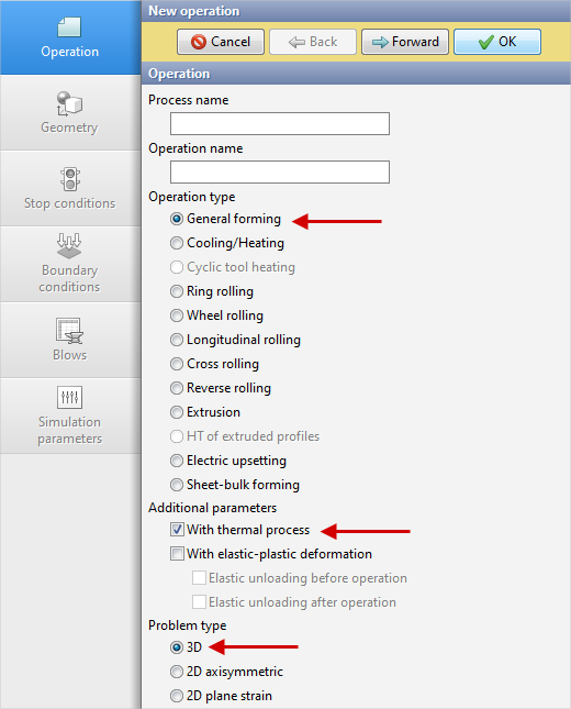 12.In the Operation tab select Operation type - General forming, With thermal process, Problem type - 3D. Click Forward.