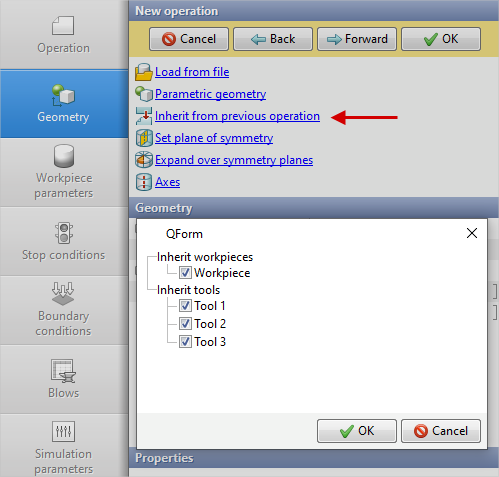 13.In the tab Geometry click Inherit from previous operation, in the new open window, check the boxes for all tools. Click OK. The Geometry of the tools will appear on screen, with the position of the tools corresponding to the final position in the first operation.Click Forward