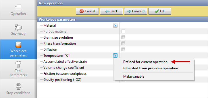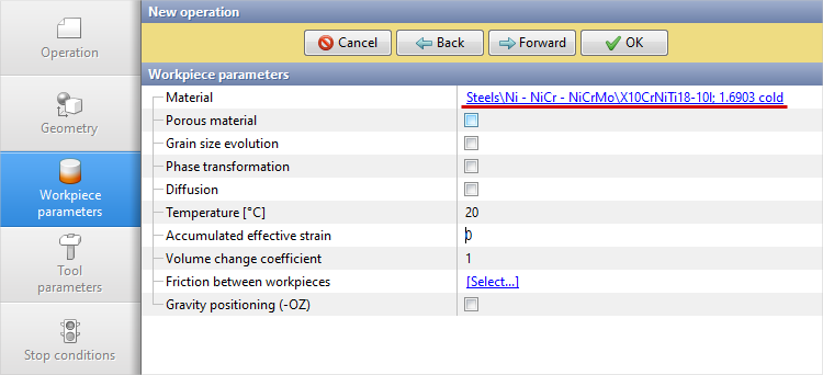 14.In the tab Workpiece parameters set the workpiece temperature to 20 °C. Next to Temperature it is should be selected Set in this operation and set the temperature 20 °C. Click Forward