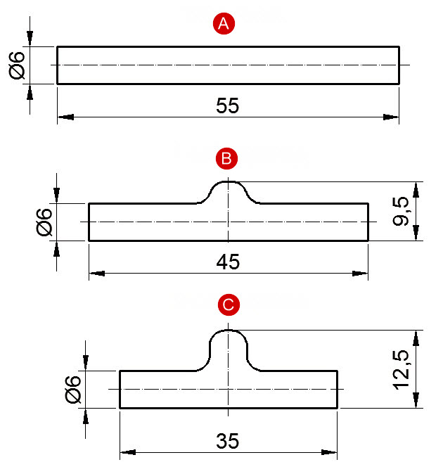 The initial workpiece is a pipe (diameter D= 6 mm, length L=55 mm, wall thickness S=0.8 mm).