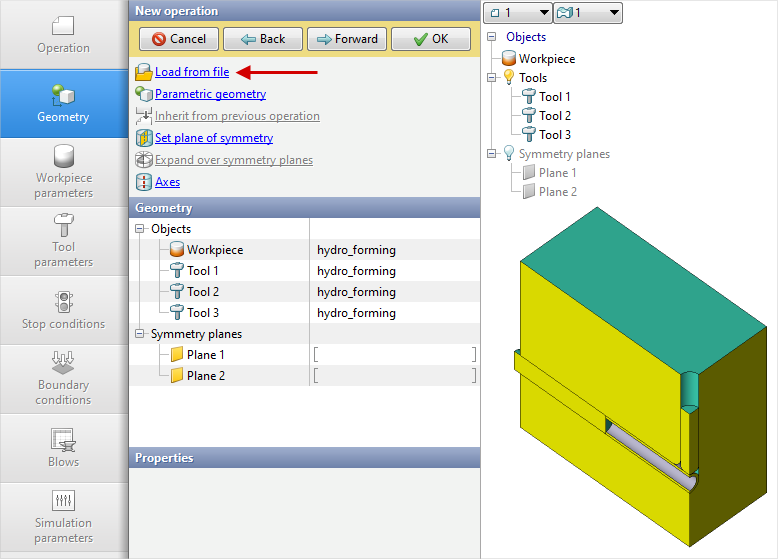 3.In the tab Geometry click Load from file and specify the path to the geometry file C:\QForm UK\12.0.1\geometry\hydro_forming\hydro_forming.shl. The uploaded geometry will appear on screen. Click Forward.