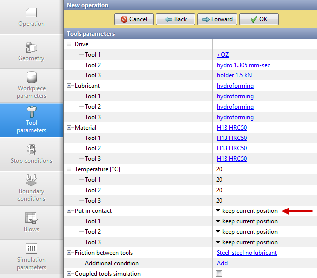 5.In the tab Tool parameters it is necessary to set the drive type, temperature and lubricant for each tool. In this example Tool 1 - the die, Tool 2 - axial upsetting punch, Tool 3 - load holder.